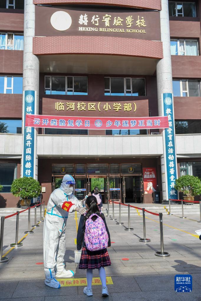 6月10日,在长春市赫行实验学校小学部,工作人员为学生测温。 新华社记者 张楠摄