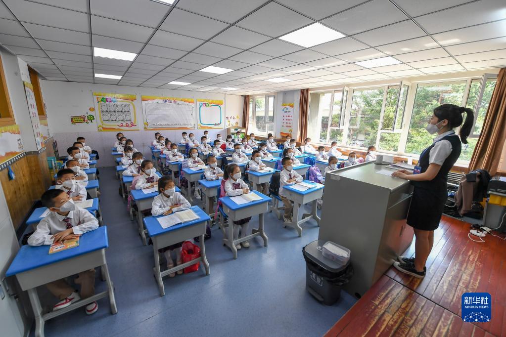 6月10日,在长春市赫行实验学校小学部,老师带领学生进行晨读。 新华社记者 张楠摄