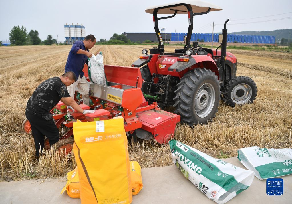 6月9日,在宝鸡市陈仓区东关街道巩家泉村,农民向播种机中添加玉米种子和肥料。