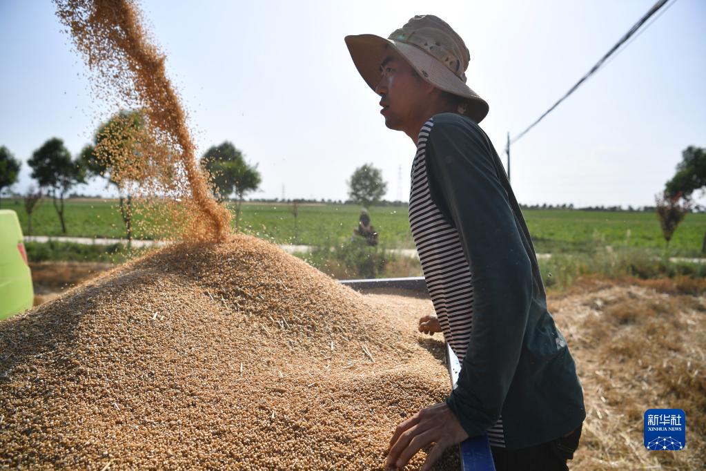 6月8日,在宝鸡市陈仓区周原镇张谢村,农民在整理收获的麦子。