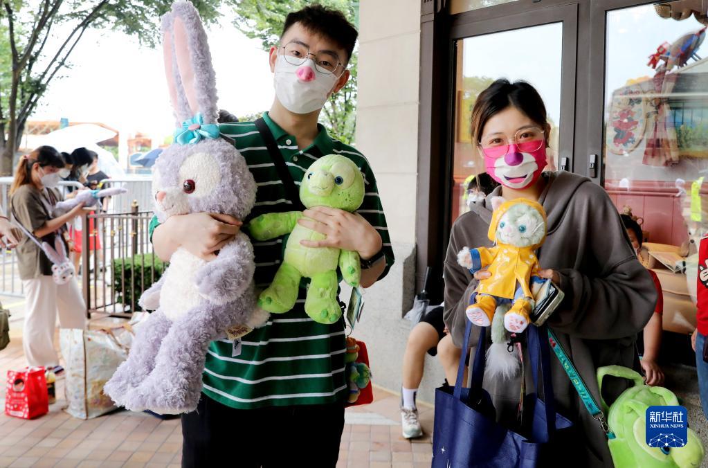 6月10日,游客在迪士尼世界商店外展示购买的商品。 新华社记者 方喆 摄