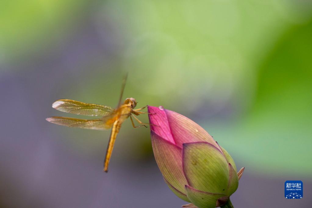 6月10日,在江苏省昆山市开发区青阳港学校荷塘,一只蜻蜓落在小荷苞上。