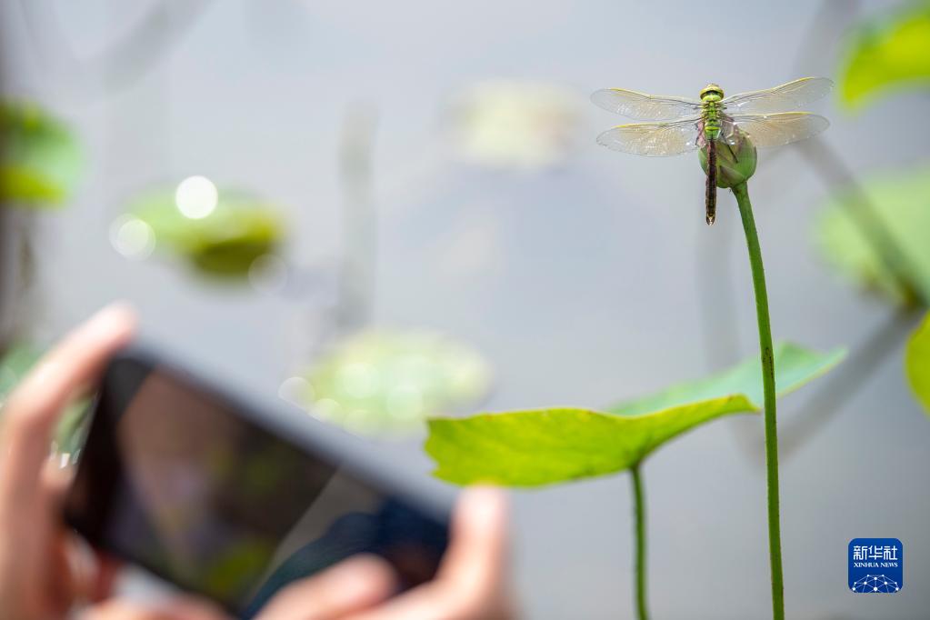 江苏省昆山市开发区青阳港学校的一位老师在拍摄落在小荷苞上的蜻蜓(6月6日摄)。