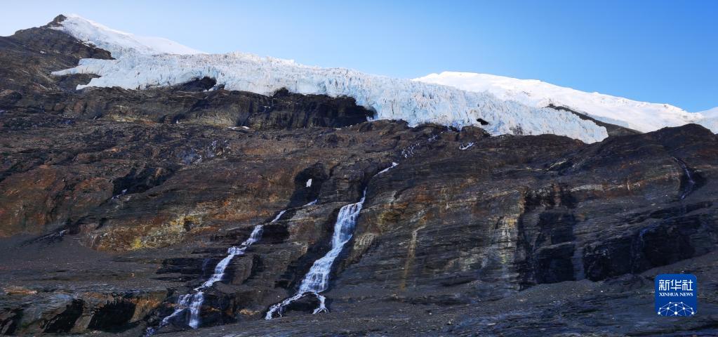 这是位于山南市浪卡子县的卡若拉冰川,冰川融水形成河流(6月3日摄,无人机照片)。