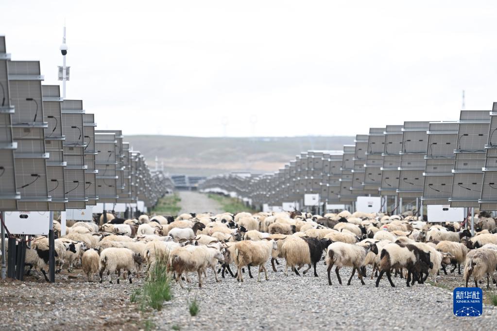 6月9日,一群羊在共和县塔拉滩华能青海公司光伏电站内活动。