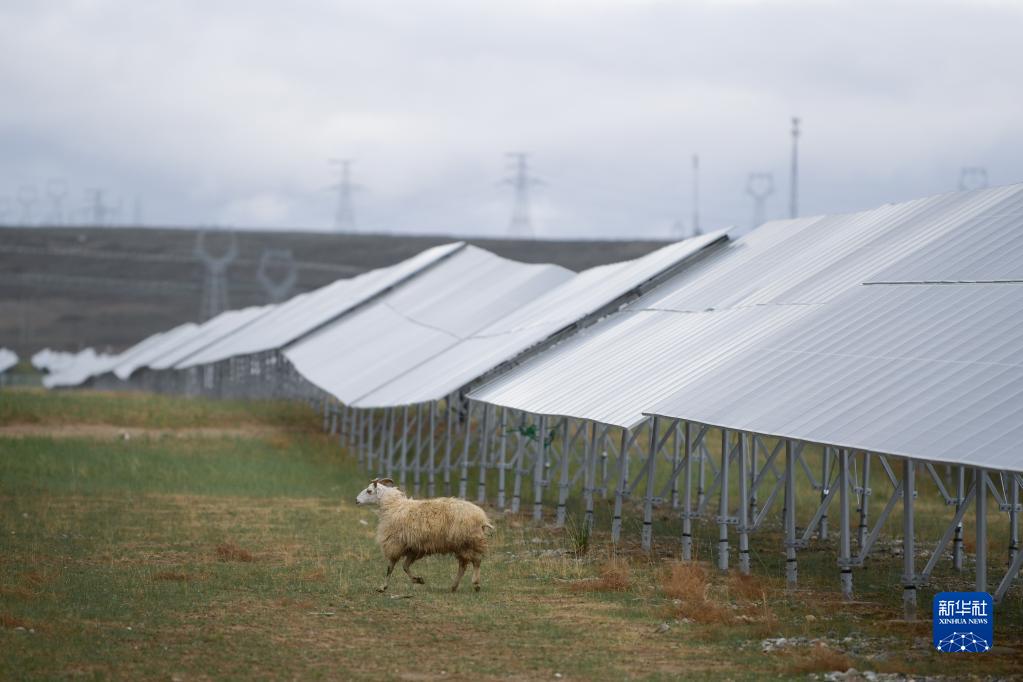 6月9日,一只羊在共和县塔拉滩华能青海公司光伏电站内活动。
