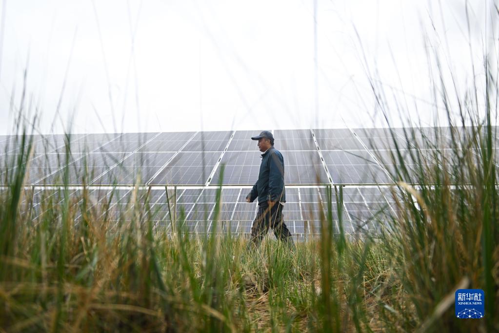 6月9日,马有福在共和县塔拉滩华能青海公司光伏电站内放羊。