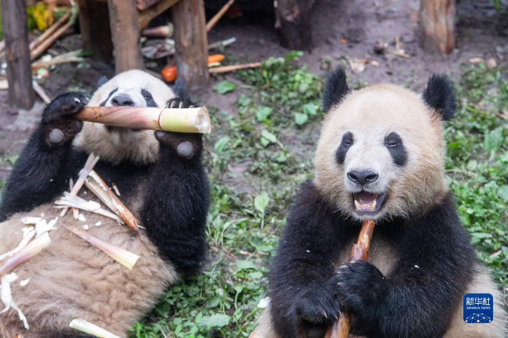 6月10日,大熊猫在生日庆典活动上享用美食。