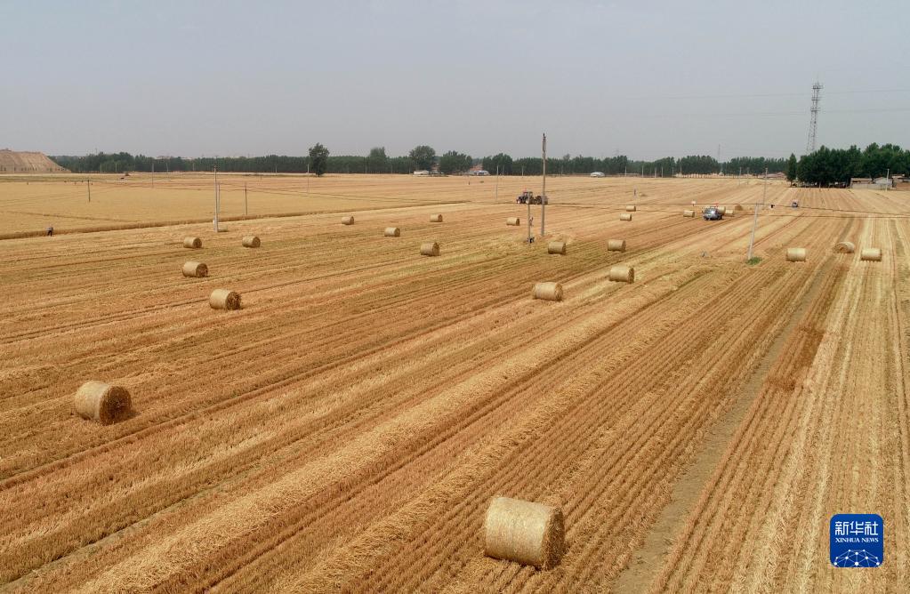 6月9日,在山东省菏泽市郓城县唐庙镇,小麦秸秆被打捆后等待运输。