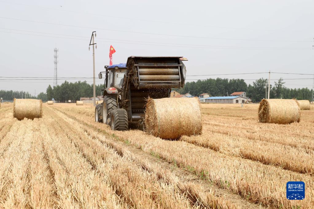6月9日,在山东省菏泽市郓城县唐庙镇,小麦秸秆打捆机在麦田工作。