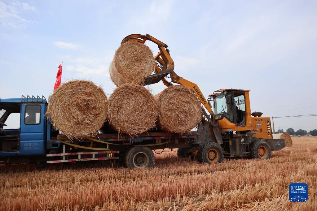 6月9日,在山东省菏泽市郓城县唐庙镇,小麦秸秆被打捆后运输离田 。