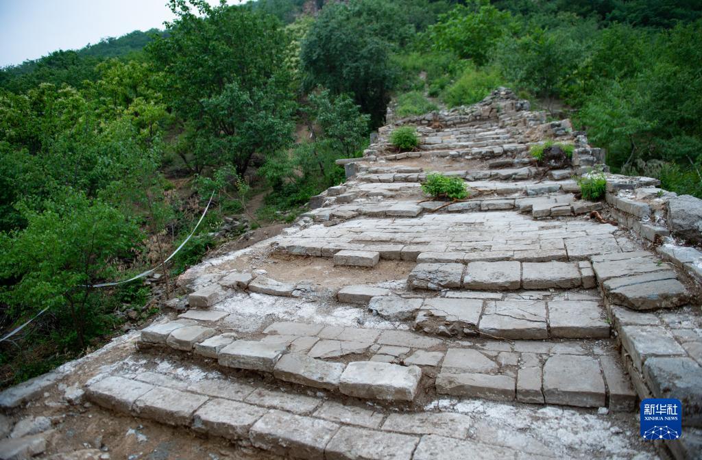 6月9日拍摄的大庄科段长城研究性修缮项目的一段长有植被的考古点位。前期考古工作明确了植被对长城建筑的影响。