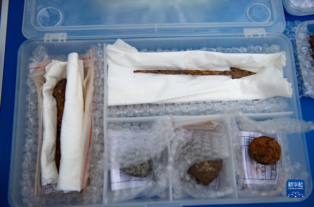 6月9日拍摄的大庄科段长城研究性修缮项目出土的文物,包含箭头、火炮弹等。