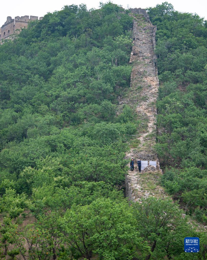 6月9日拍摄的大庄科段长城延庆2号敌台与3号敌台间的一段墙体。工作人员所站的位置是研究性修缮项目的一处考古点。