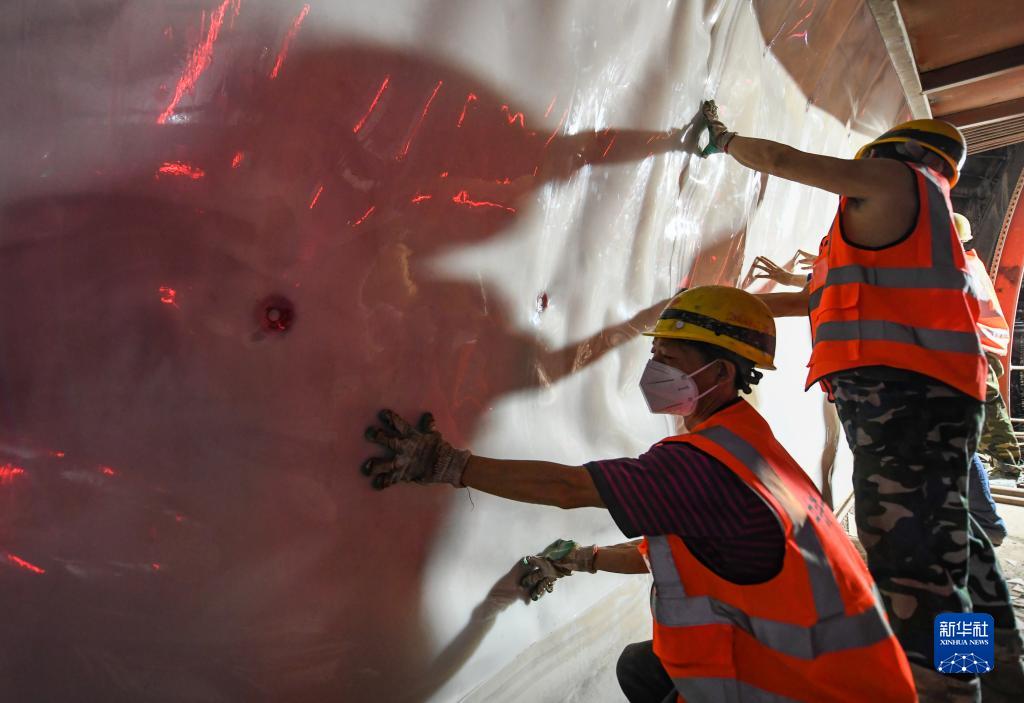6月10日,在四川省宜宾市屏山县仁沐新高速公路太平隧道内,施工人员进行隧道防水板铺设。 新华社记者 王曦 摄