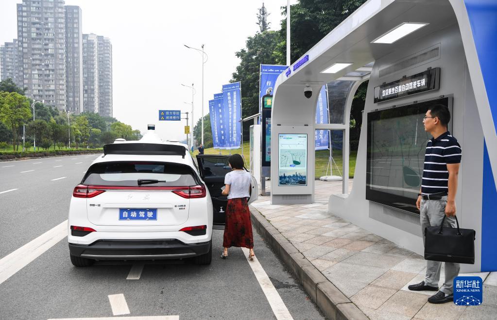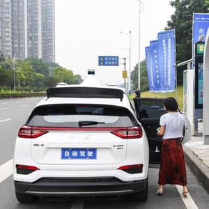 6月10日,在重庆永川城区,乘客乘坐百度Apollo自动驾驶出行服务车。
