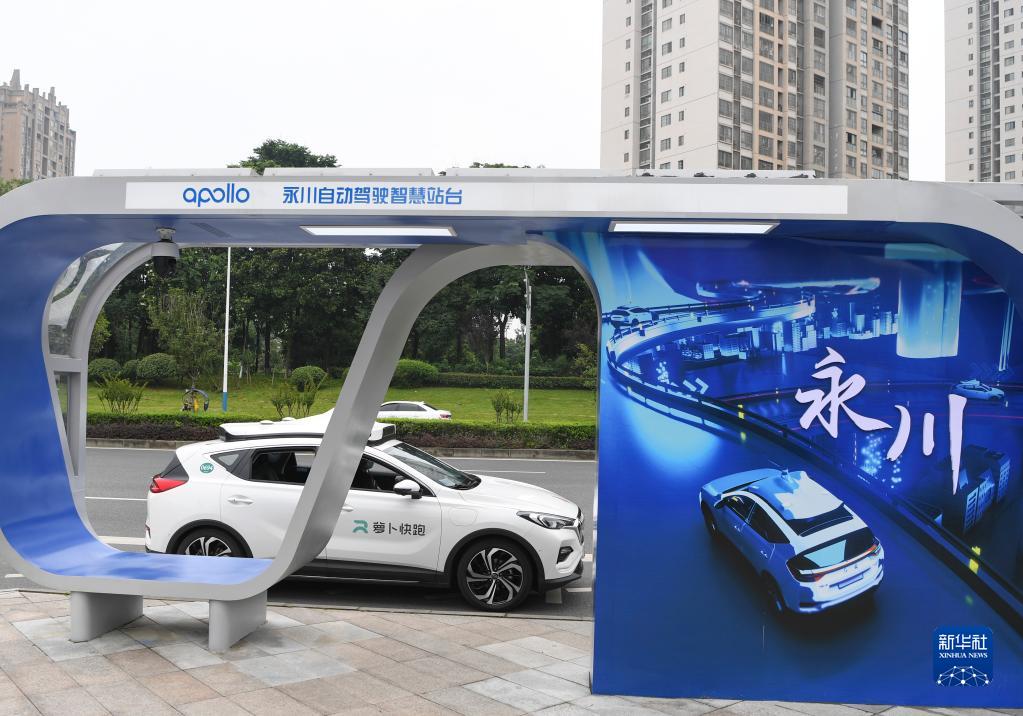 6月10日,百度Apollo自动驾驶出行服务车停靠在重庆永川自动驾驶智慧站台。