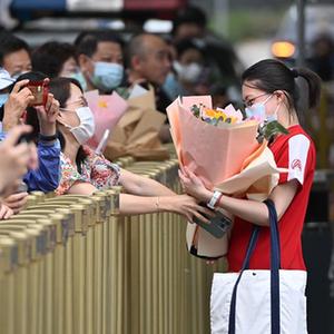 6月10日,在北京师范大学附属实验中学考点门口,考生家长为走出考点的考生送上鲜花。
