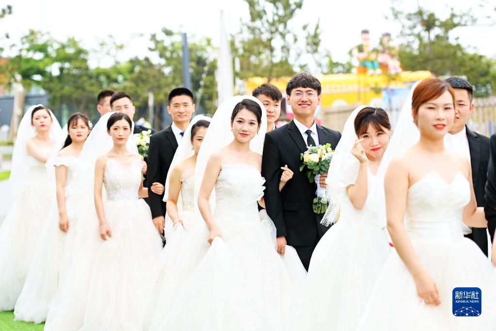6月10日,参加集体婚礼的新人们步入现场。
