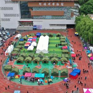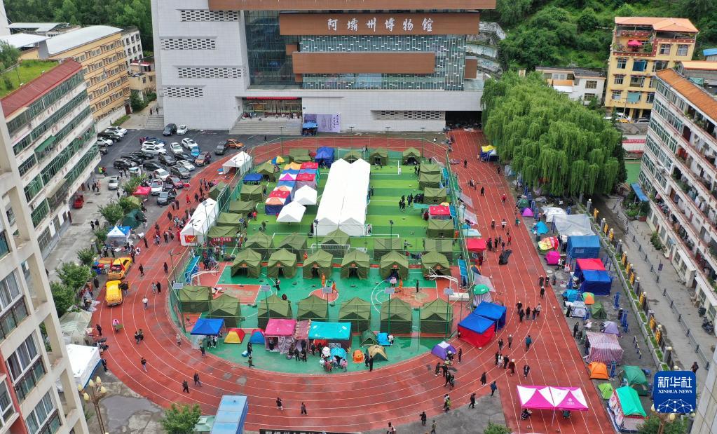 6月10日拍摄的马尔康市州医院背后广场安置点(无人机照片)。新华社记者 刘坤 摄