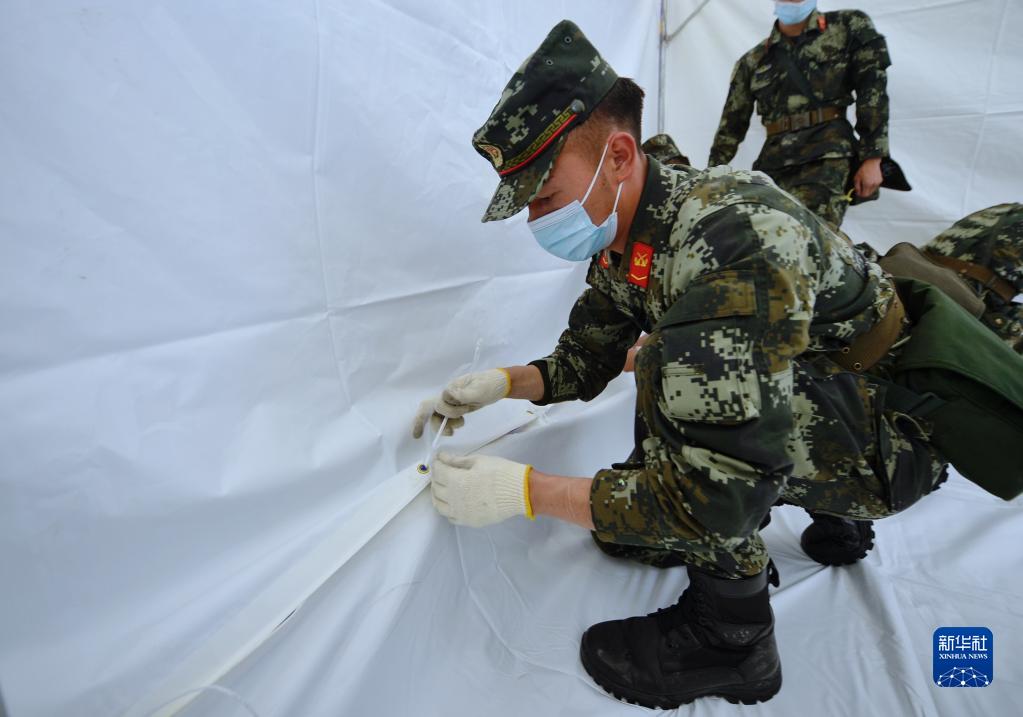 6月10日,在马尔康市州医院背后广场安置点内,武警阿坝支队队员在搭建帐篷。新华社记者 刘坤 摄