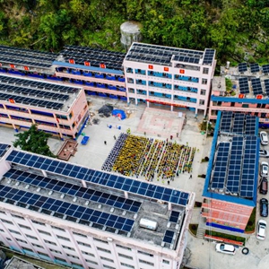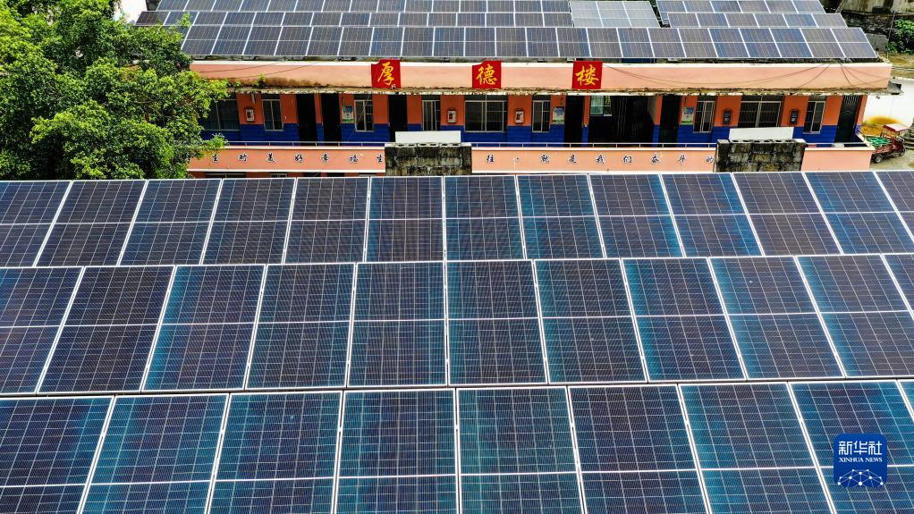 6月10日拍摄的广西大化县北景镇板兰村小学屋顶光伏板(无人机照片)。