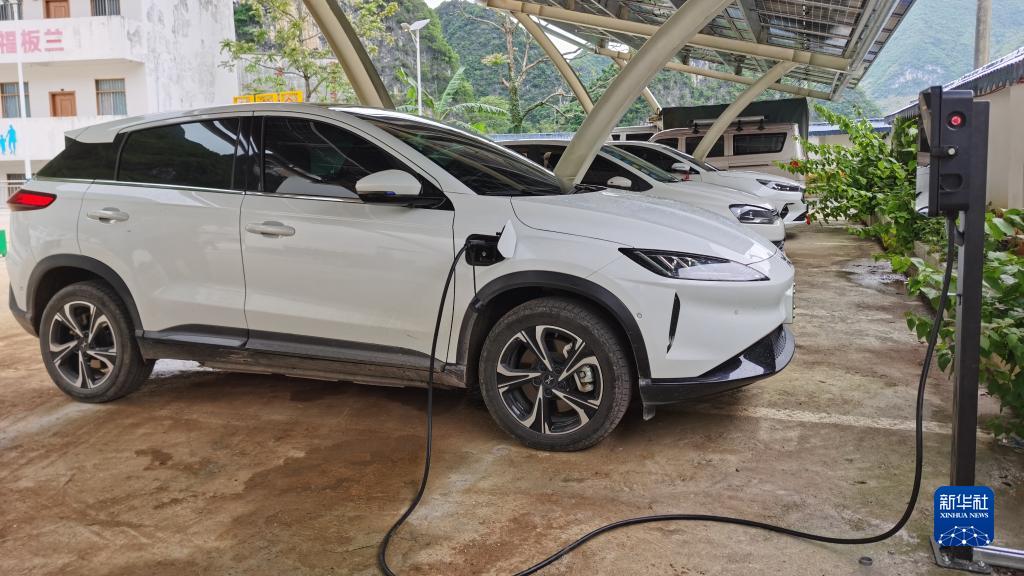 在广西大化县北景镇板兰村,一辆新能源汽车在充电(5月9日摄,手机照片)。