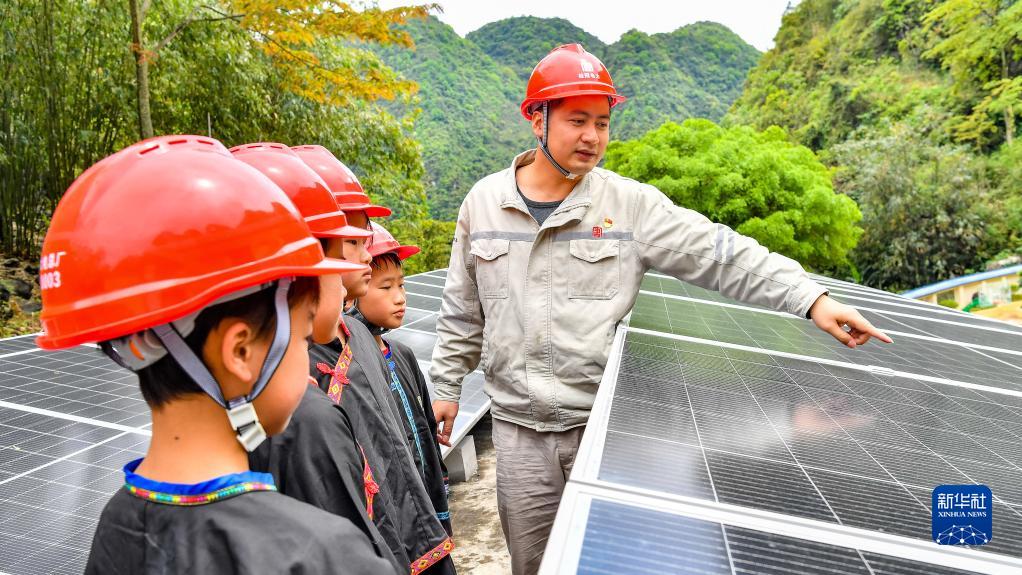 在广西大化县北景镇板兰村,工作人员在给小学生讲解光伏发电知识(3月30日摄)。