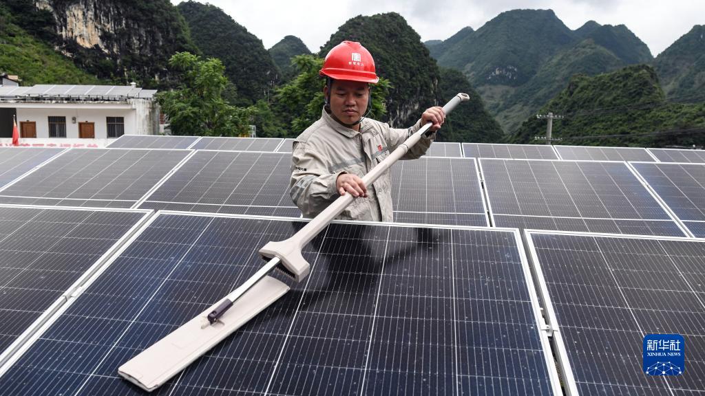 在广西大化县北景镇板兰村,工作人员韦大林在清洁光伏板(6月10日摄)。