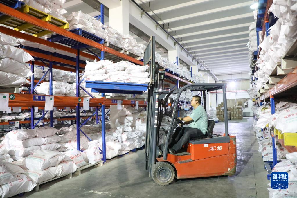 6月11日,在陇西奇正药材有限责任公司的仓储车间,工作人员整理中药材货品。