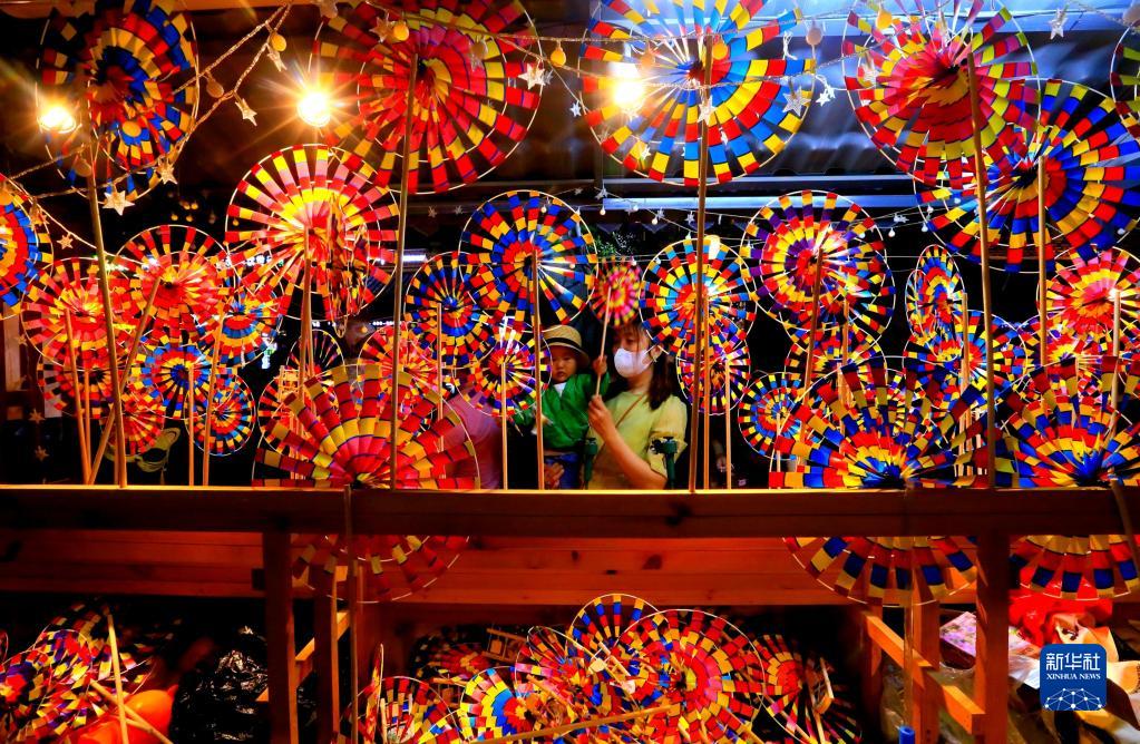 6月3日晚,游客在山东省青岛市即墨古城选购风车。