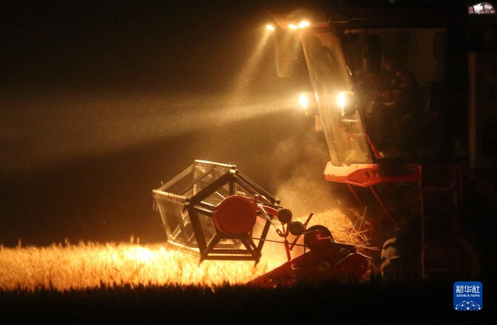 “三夏”时节,在山东省临沂市沂南县麦收现场,收割机连夜抢进度,力保颗粒归仓。
