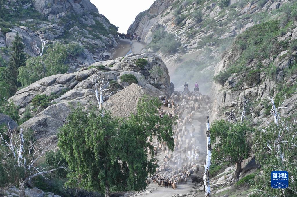6月5日,在新疆阿勒泰地区福海县沙尔布拉克春秋牧场转往夏季牧场的牧道上,牧民赶着牲畜向夏季牧场进发。