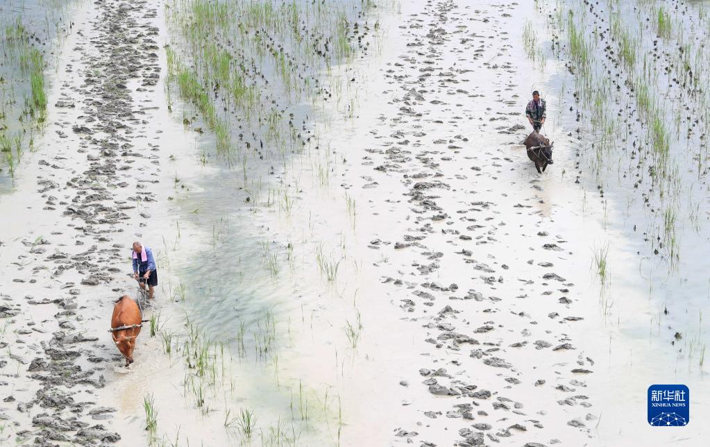 6月6日,在贵州省榕江县寨蒿镇平堡村,村民用耕牛翻耕稻田。