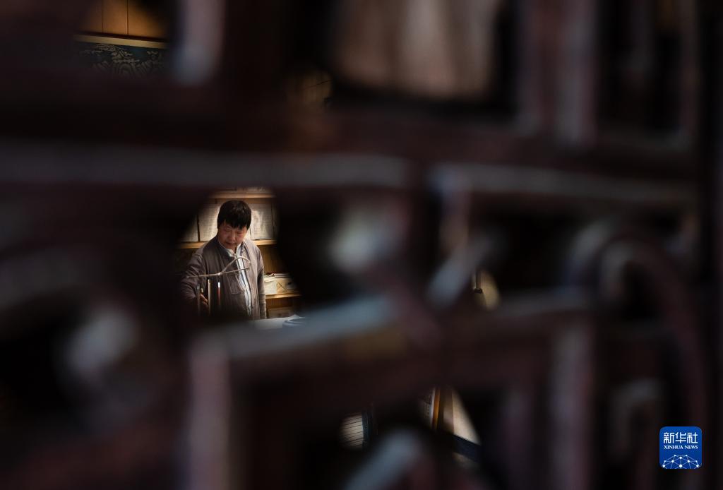 阿六叔在恒裕公民居博物馆内练习书法(6月10日摄)。