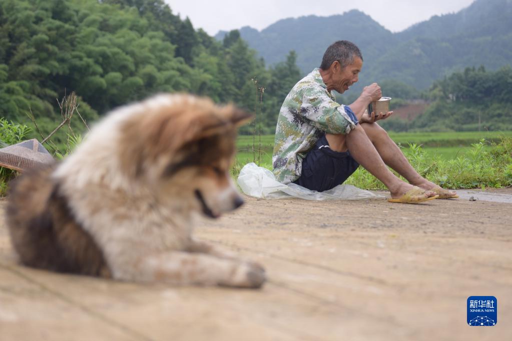 6月10日,在贵州省黔东南苗族侗族自治州岑巩县思旸镇盘街村,村民在插秧间隙吃饭。