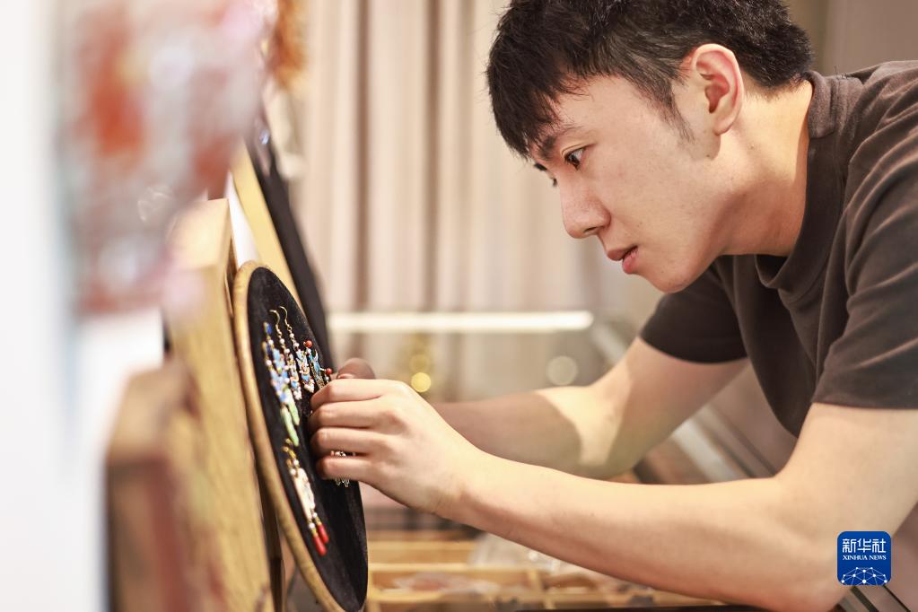 辜国强在摆放花丝镶嵌作品(4月20日摄)。