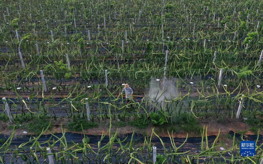 6月9日,在海南省东方市三家镇乐安村燕窝果基地,农民在喷洒农药(无人机照片)。