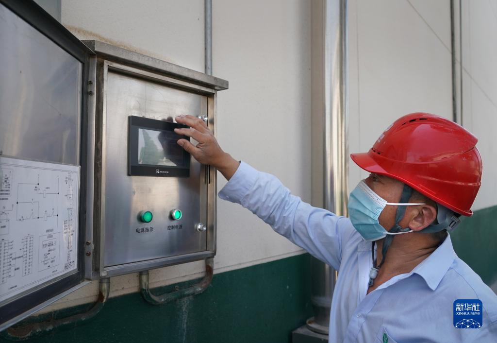 工作人员在中央储备粮鹤壁直属库有限公司浚县分公司内调试内环流均温控制系统(6月10日摄)。