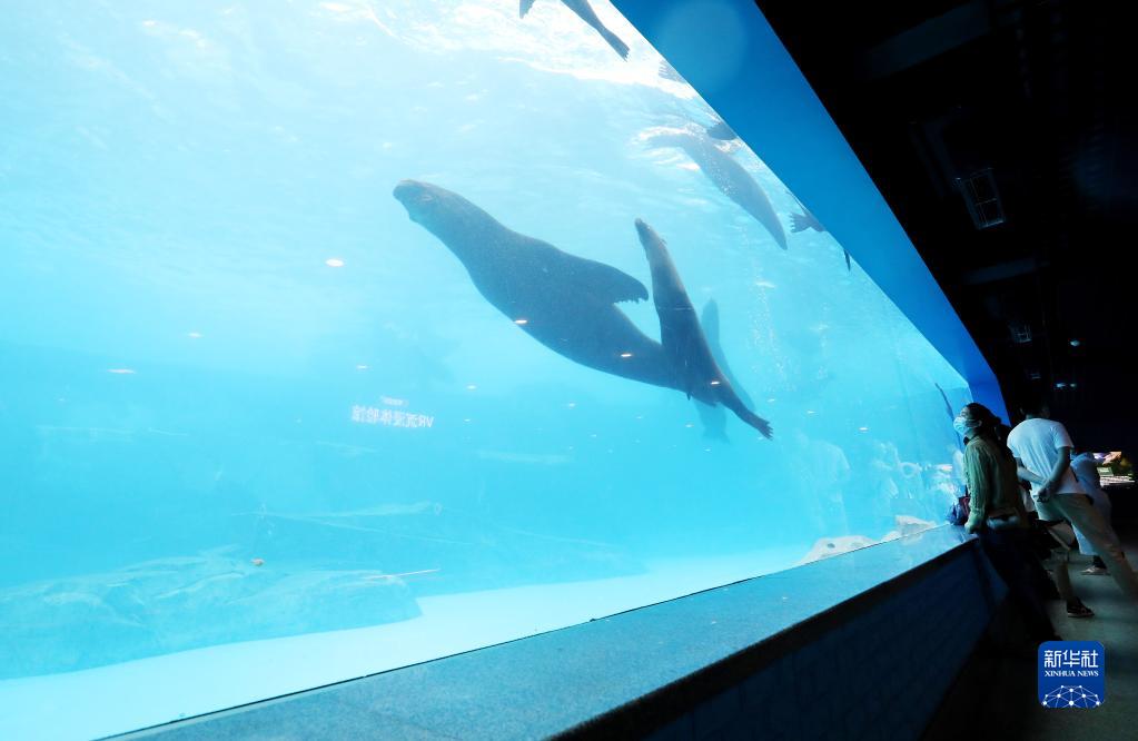 6月12日,游客在上海海昌海洋公园海兽探秘馆内观看海豹。