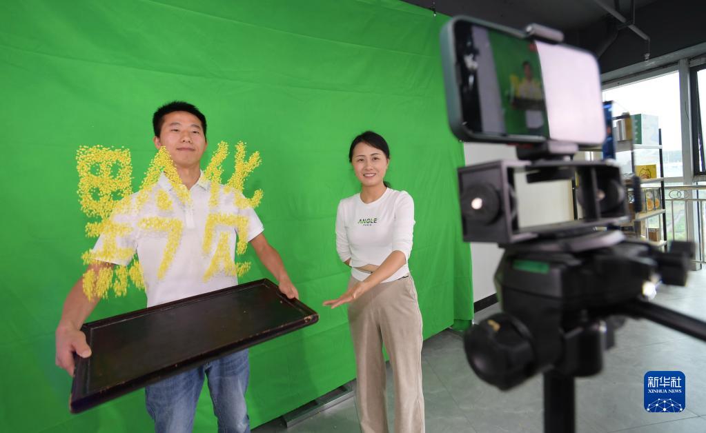 6月12日,在贵州省绥阳县农产品集散中心,蒋荣庆(左)和伙伴为粉丝现场直播抖字“黔货”。