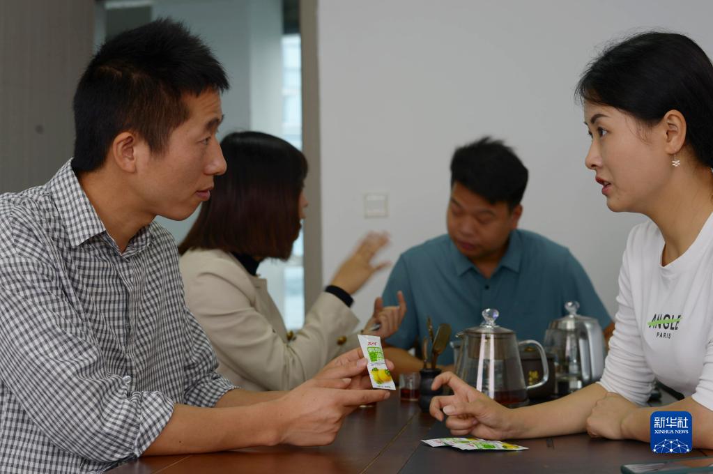 6月12日,蒋荣庆(前左)和伙伴在贵州省绥阳县农产品集散中心商量直播销售事宜。