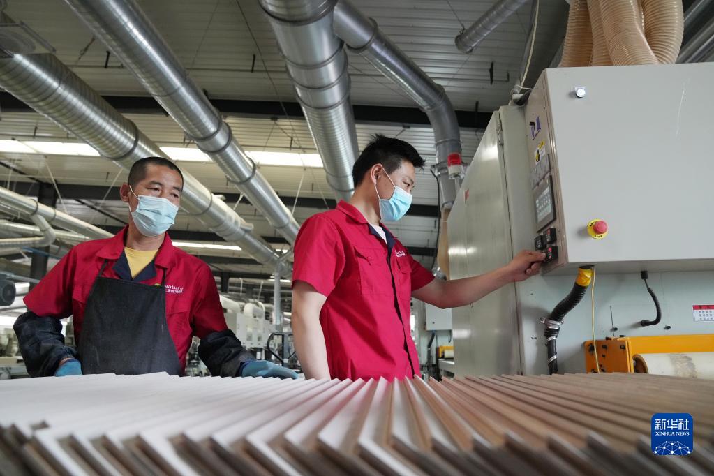 6月10日,在绥芬河片区大自然木业有限公司生产车间,工作人员在操控数字化生产线。