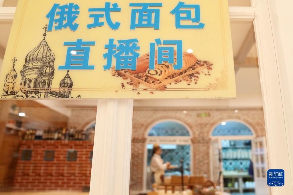 6月9日,在绥芬河一处跨境电商直播基地,销售俄式面包的电商商家在进行直播。