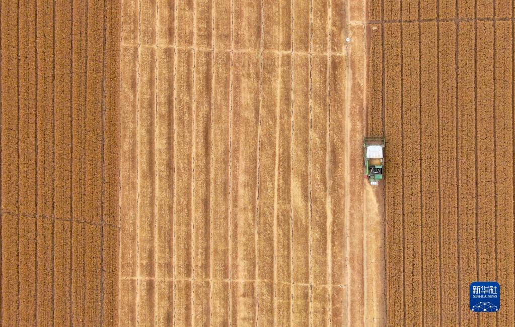 6月9日,在河南省安阳市汤阴县菜园镇高标准农田示范区,收割机在麦田作业(无人机照片)。