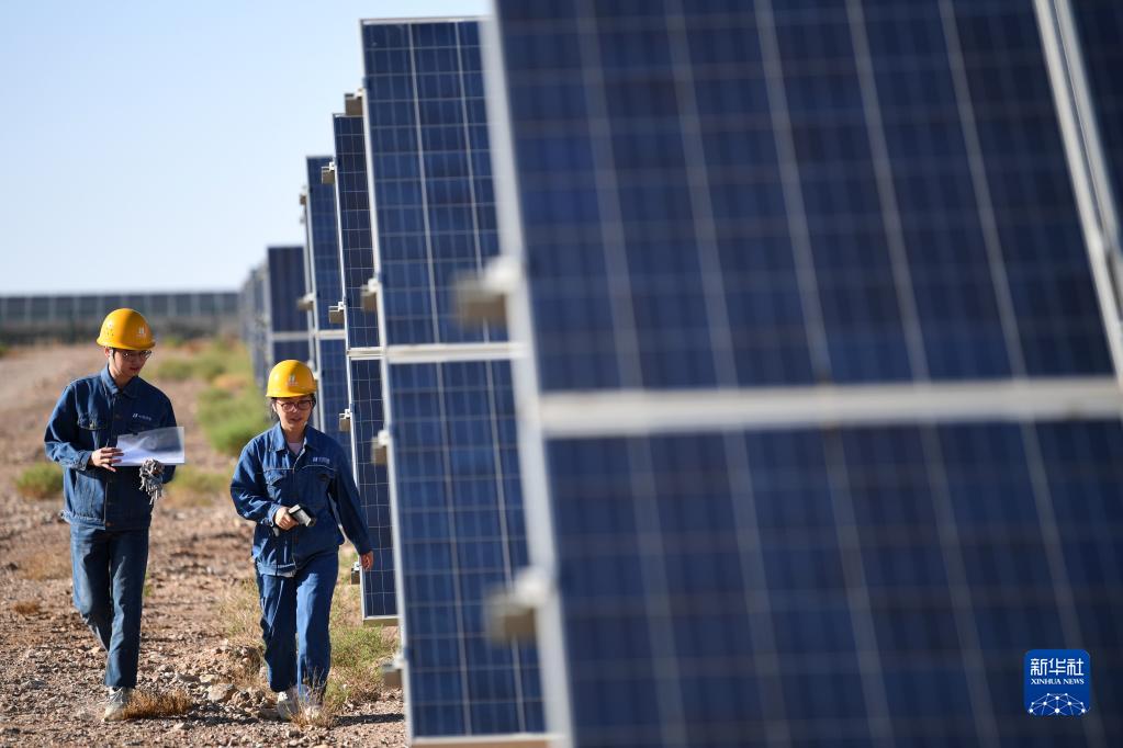华能集团西坡光伏电站工作人员李静(右)和同事在现场巡检(6月13日摄)。