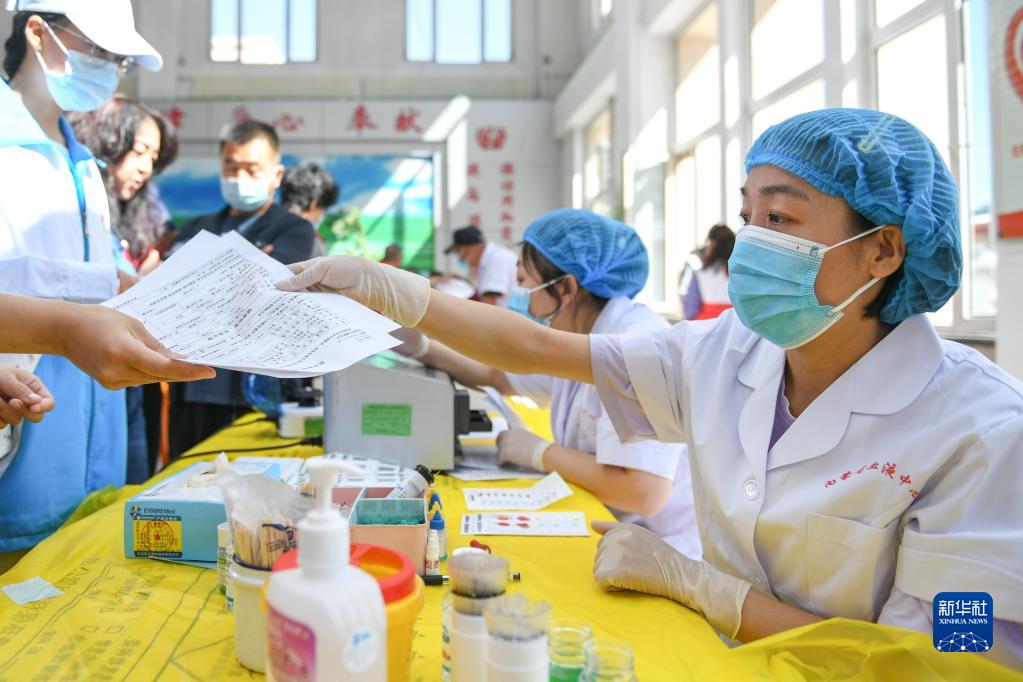 6月14日,在位于呼和浩特市的内蒙古自治区血液中心大厅,工作人员收集献血者相关材料。