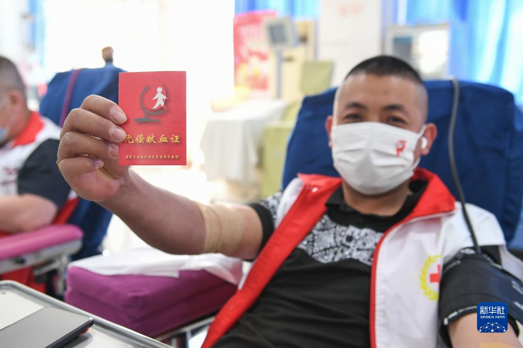6月14日,在位于呼和浩特市的内蒙古自治区血液中心,志愿者在献血时展示无偿献血证。
