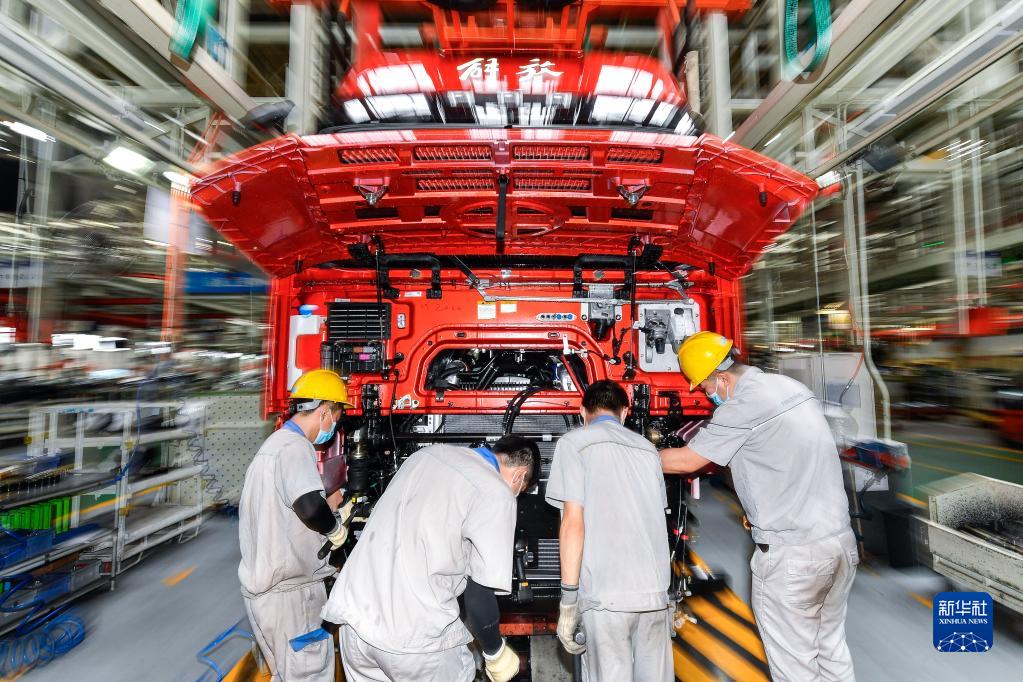 6月15日,工人在位于吉林长春的一汽解放总装车间内装配车辆。