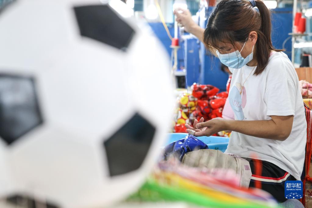 6月15日,工作人员在贵州务川一家企业内缝制足球。